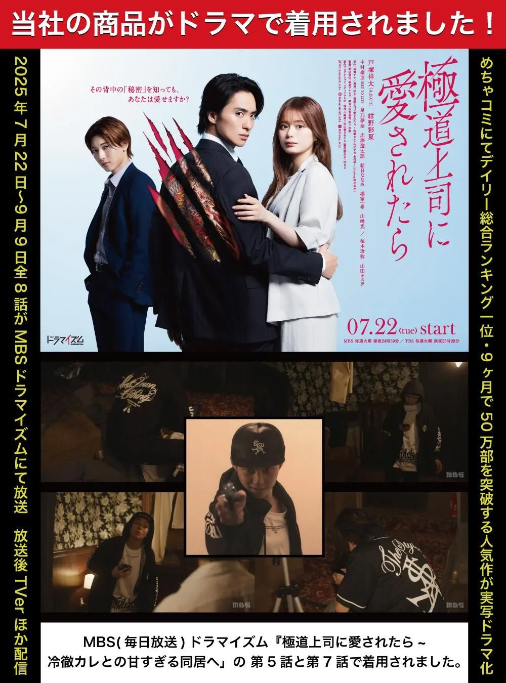 9/9最終回を迎えるMBS(毎日放送)ドラマイズム『極道上司に愛されたら~冷徹カレとの甘すぎる同居へ」の第5話と第7話で着用されているのですが、特に第7話では出ずっぱりで大立ち回りをみせる全身弊社の商品を着用した半グレ集団・浅羽連合の金子と金子の仲間が着用しています。